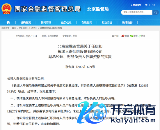 在中国保障行业的高管式样中,长城东说念主寿近期凭借别具一格的东说念主事安排,告捷诱骗了业内目力。 手脚一产品有国资布景的寿险企业,它不仅领有业内鲜见的“双党委副布告”竖立,还在投资领域斩获了令东说念主颂扬的佳绩。 2025年11月14日,北京金融监管局的批复文献,使得任庆和崇敬获批担任长城东说念主寿副总司理兼财务负责东说念主。