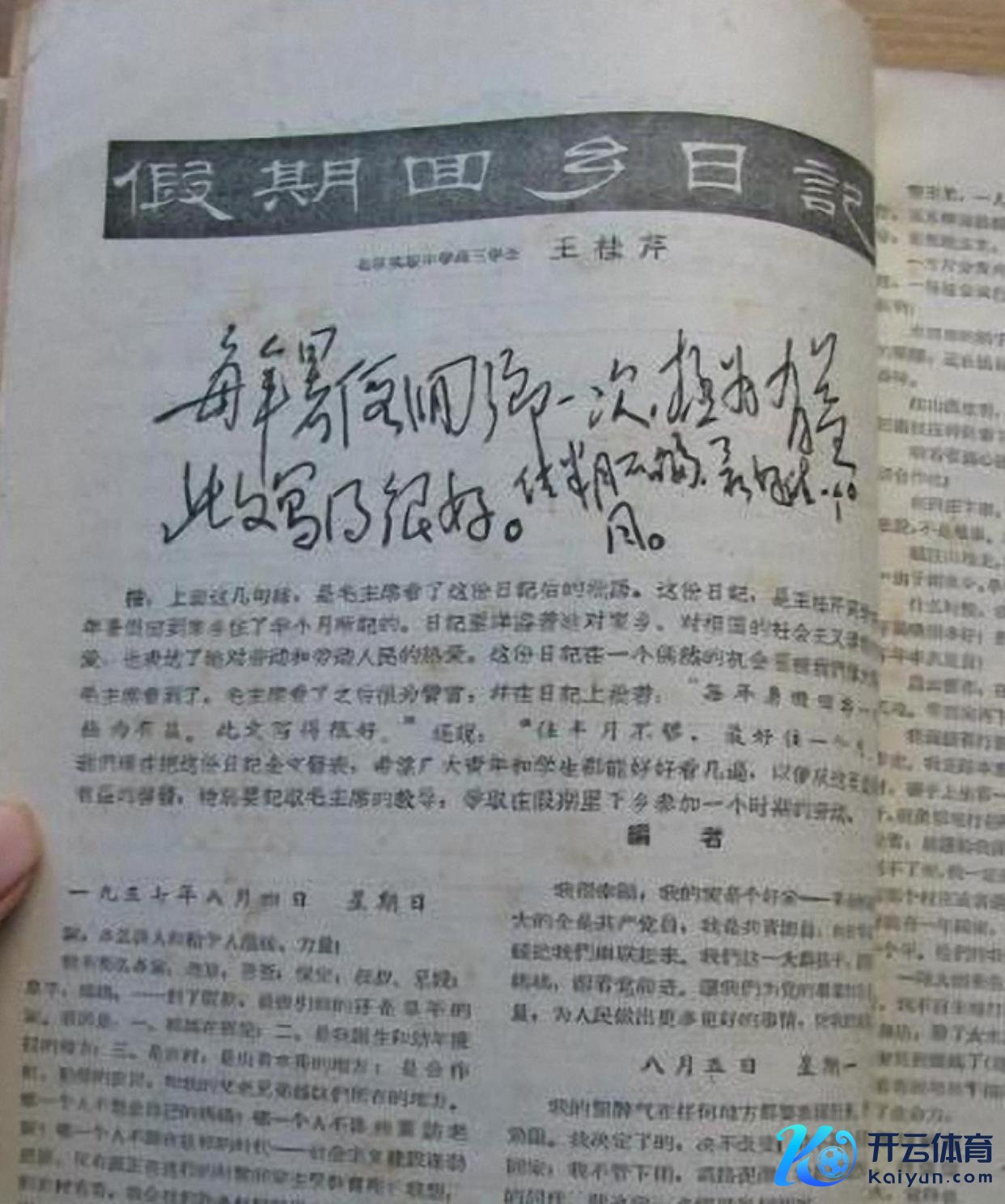 看他极为熟练地将其中的错别字挑出来并在一旁修正,看他时时常笑脸满面地在文段傍边画圈。 这些习尚她是极为纯熟的,父亲认为写得好或者让我方惬意的处所就会画圈暗示出来。 而这开云体育(中国)官方网站篇幅并不算长的高中诞辰志,毛主席更是绝不惜啬地画了三十多个圈,由此可见他内心的惬心。 就这他还尚显不可抒发我方的心想,在著作最末的一页,注重地写谈: “暑假回乡极为成心,半月不及可一月。”