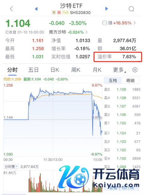 1月10日音书,多只跨境ETF尾盘大面积跳水开云体育,以华泰柏瑞沙特ETF(520830)为例,该基金14点34分价钱1.229元,到14点37分价钱1.031元,即短短3分钟内,暴跌16%。截止收盘,跌超3%,溢价率仍高达7%。全天成交额36亿元,换手率972%。