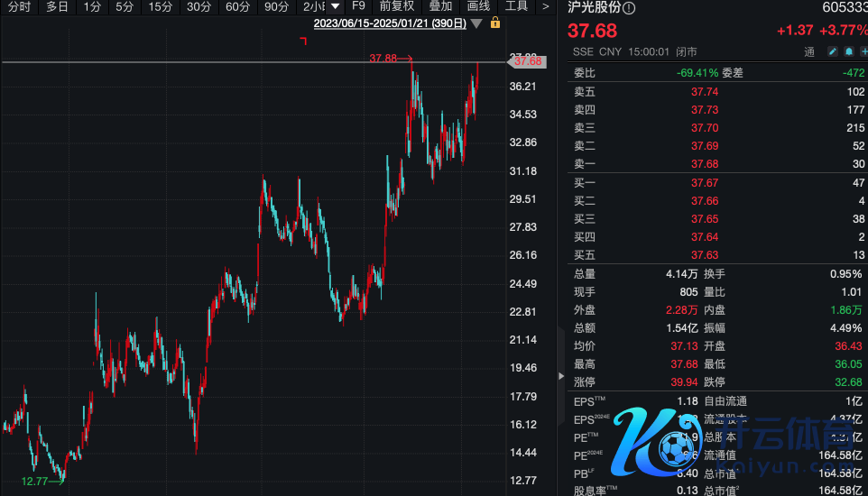 跟着事迹快速增长,沪光股份的股价情随事迁。2025年1月21日,沪光股份收盘价为37.68元/股,自旧年事首低点以来已翻倍。